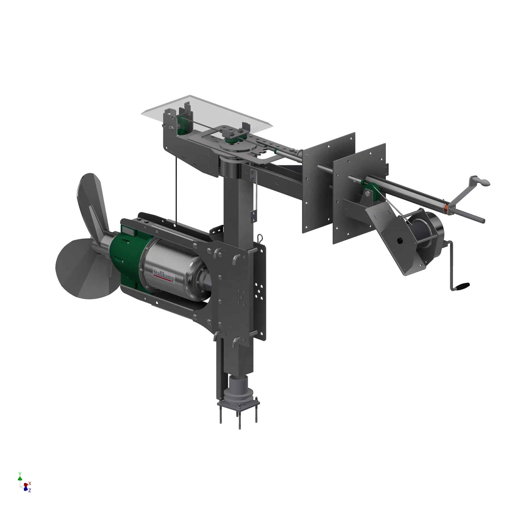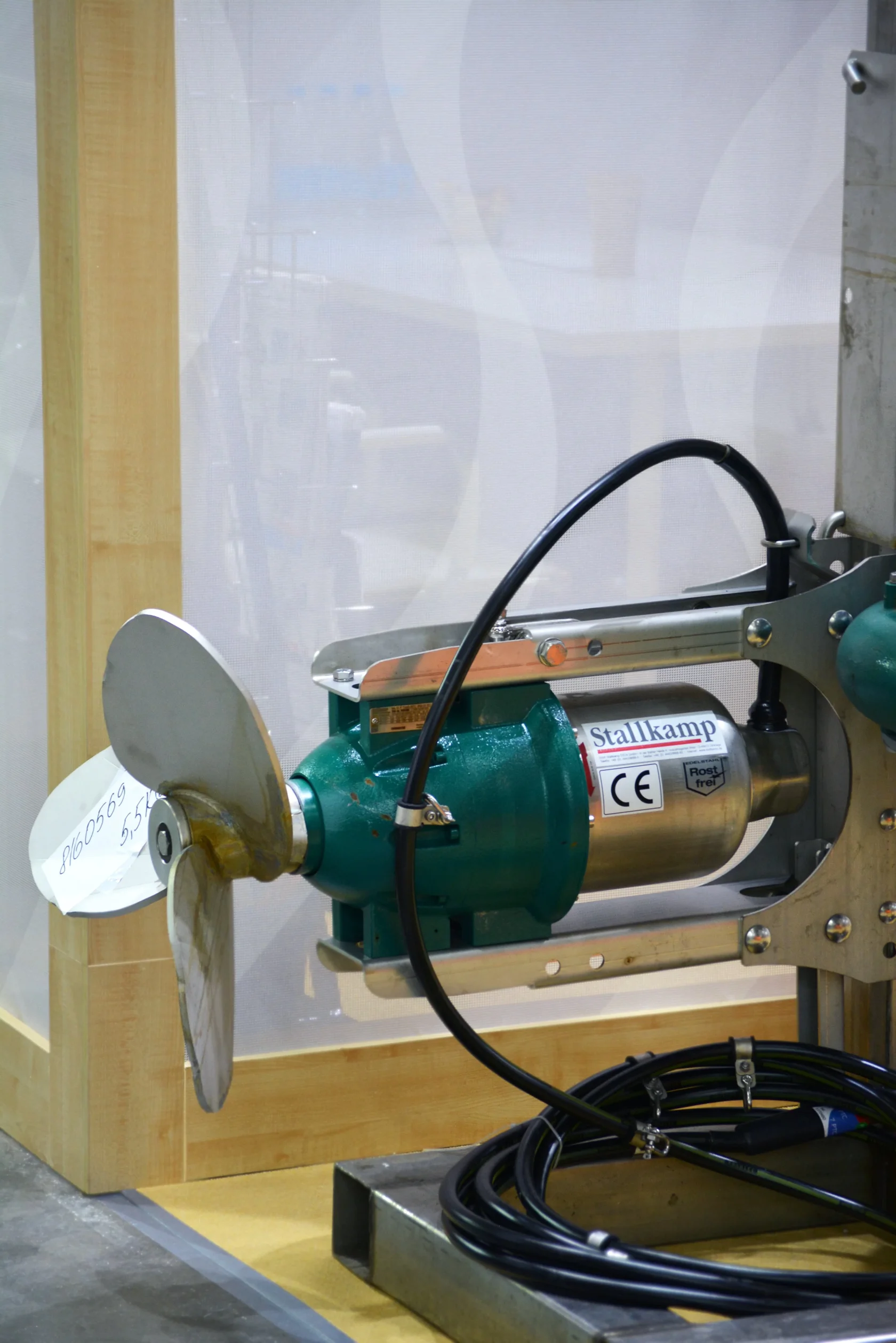 Мощное перемешивания в навозных каналах: Высокопроизводительный складной пропеллер создает сильное направленное течение. Складной пропеллер раскрывается под воздействием центробежной силы при включении двигателя. Он обладает внушительной мощностью, сравнимой с мощностью винта корабля