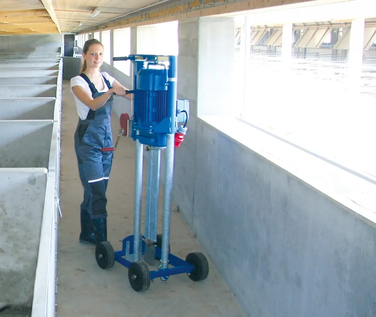 Требуемые размеры щелей в полу свинарника: минимальная ширина 1,7см и минимальная длина 15см Длина миксерной штанги от верхней кромки плиты щелевого пола, включая пропеллер, достигает 160см Мощность от 4,0кВт до 7,5кВт